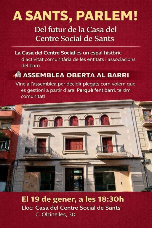 Segons la informació difosa, la convocatòria vol fomentar una reflexió compartida sobre com es vol que es gestioni la Casa del Centre Social a partir d’ara, apel·lant a la participació directa del veïnat i de les entitats del barri. El cartell defineix l’espai com un lloc històric d’activitat comunitària vinculat a les associacions i col·lectius de Sants.