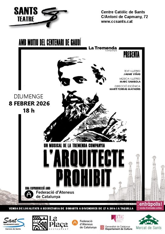 El Sants Teatre presentarà diumenge 8 de febrer de 2026, a les 6 de la tarda, el musical L’arquitecte prohibit, una producció de La Tremenda Companyia que s’inscriu dins dels actes commemoratius del centenari de Gaudí. L’espectacle tindrà lloc al Centre Catòlic de Sants, situat al carrer Antoni de Capmany, 72.