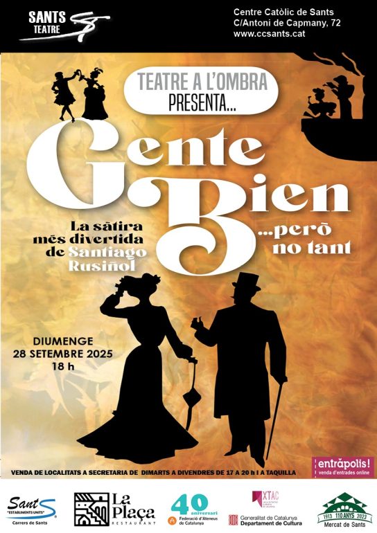 El Centre Catòlic de Sants acollirà el diumenge 28 de setembre de 2025 a les 18 h la representació de Gente Bien… però no tant, una de les sàtires més conegudes i divertides de Santiago Rusiñol, de la mà de la companyia Teatre a l’Ombra.