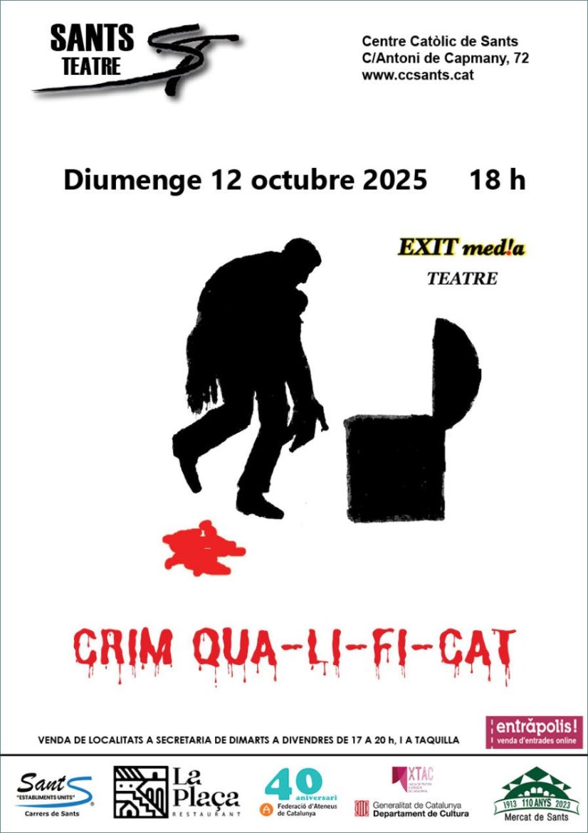 El Teatre del Centre Catòlic de Sants acollirà el diumenge 12 d’octubre de 2025, a les 18 h, la representació de Crim qua-li-fi-cat, una producció de la companyia Èxit Med!a Teatre que combina intriga, humor i crítica social. L’obra promet mantenir el públic en tensió mentre es desplega una trama de misteri marcada pel suspens i els girs inesperats, amb un estil que juga entre la comèdia negra i el […]